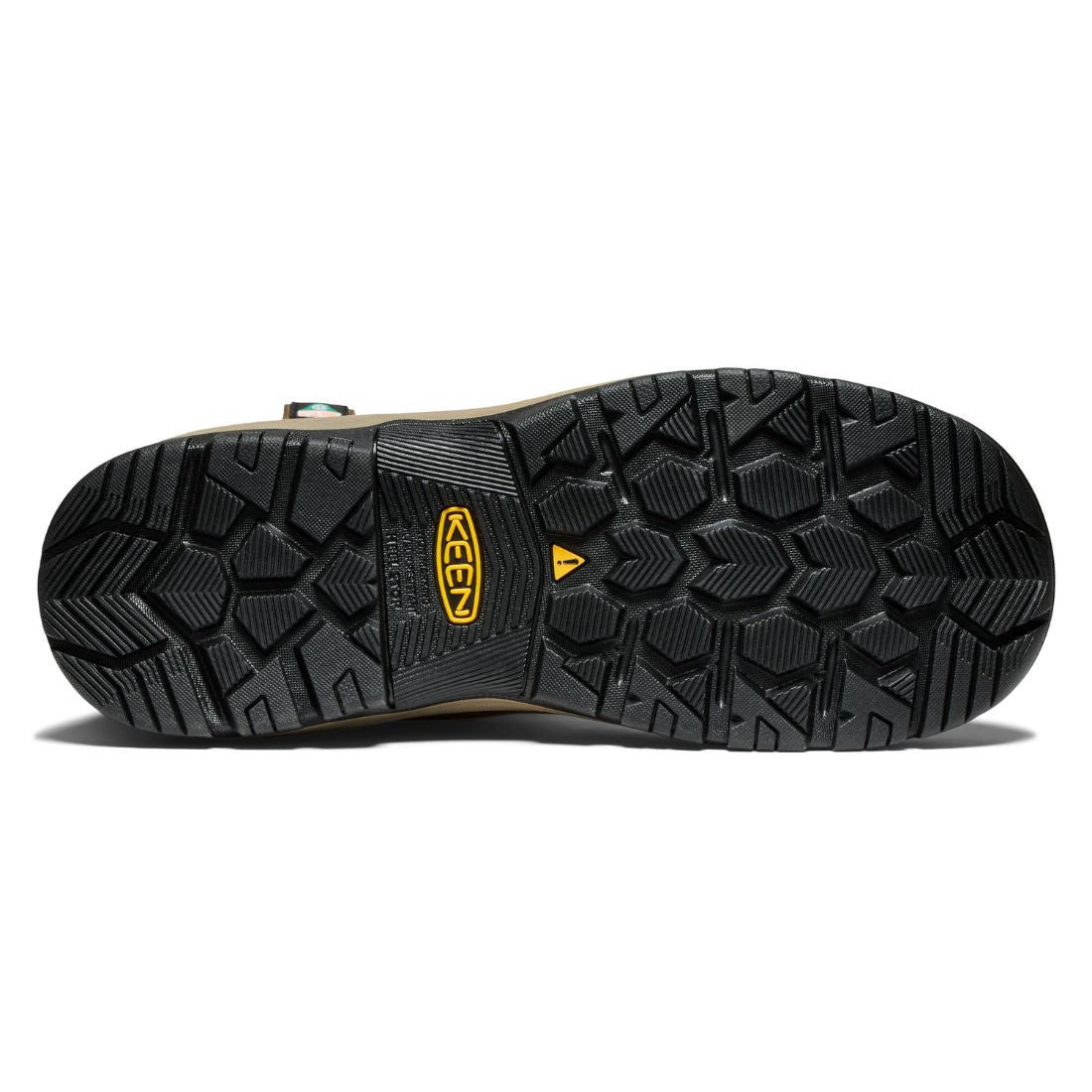 La semelle extérieure en caoutchouc, résistante à l'huile et antidérapante, ne laisse pas de traces et supporte des températures jusqu'à 300 °C (572 °F). Son talon à 90° assure une stabilité optimale sur les échelles, les échafaudages et les terrains accidentés. La semelle intermédiaire KEEN.ReGEN offre un amorti léger avec un retour d'énergie jusqu'à 50 %, soutenu par une tige en nylon pour une meilleure stabilité du médio-pied. À l'intérieur, une doublure en mesh respirant et une semelle intérieure amovible de forme anatomique garantissent un confort et un soutien durables tout au long de la journée.